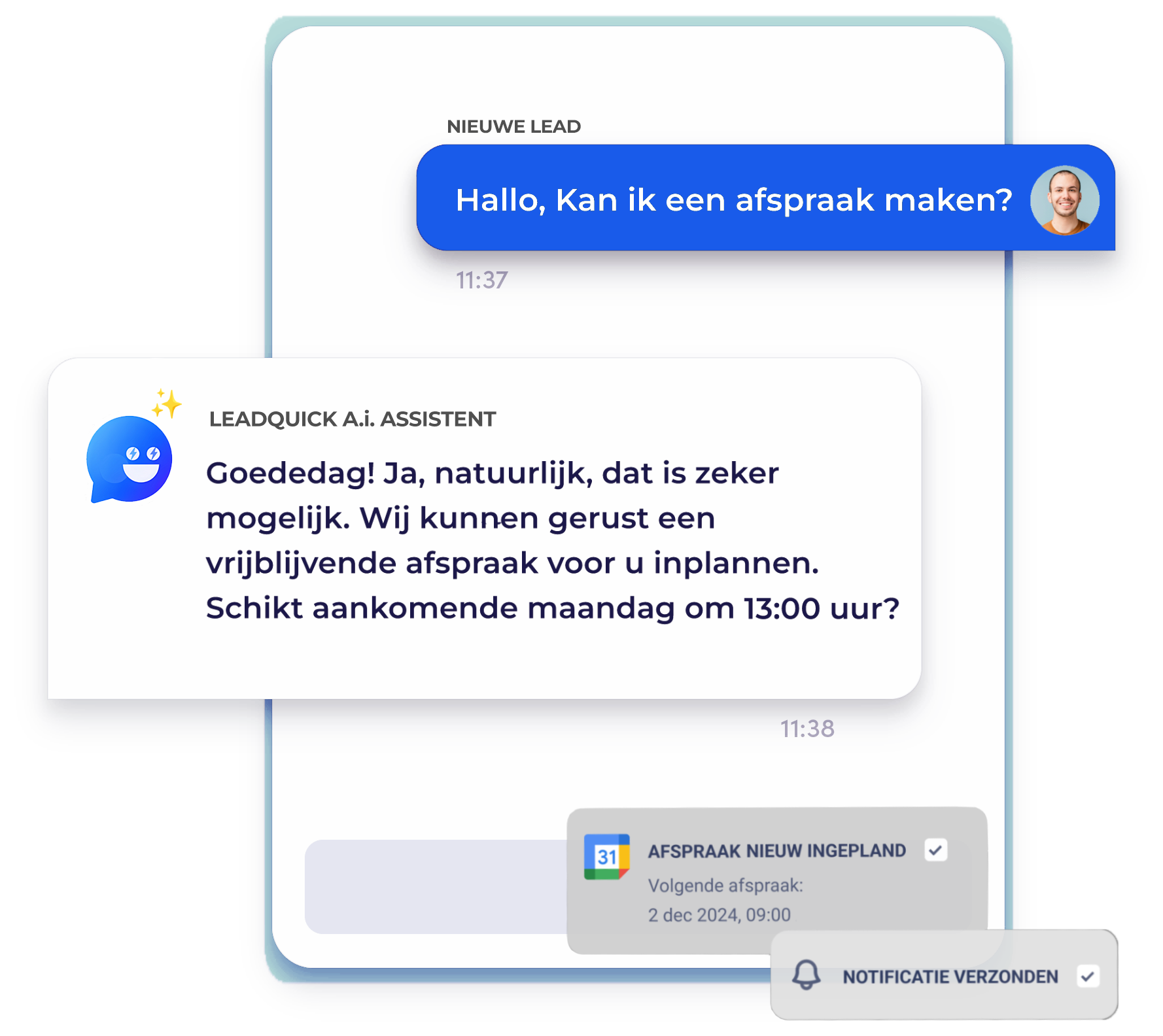 Na het ontvangen van een lead volgt onze AI automatisch binnen enkele minuten de lead op, stelt de juiste kwalificatievragen, en plant direct een afspraak in je agenda. Geen handmatig werk meer nodig.